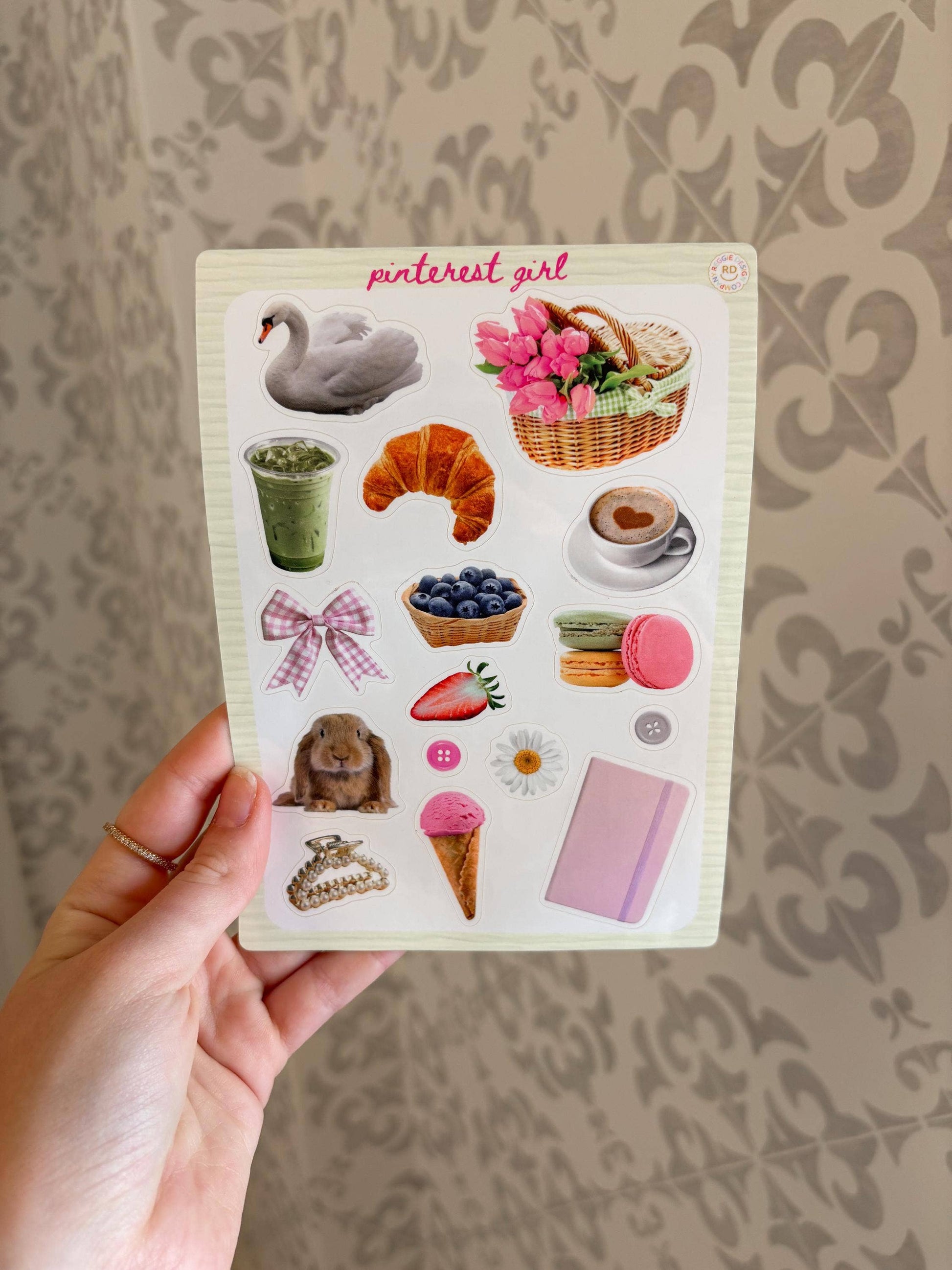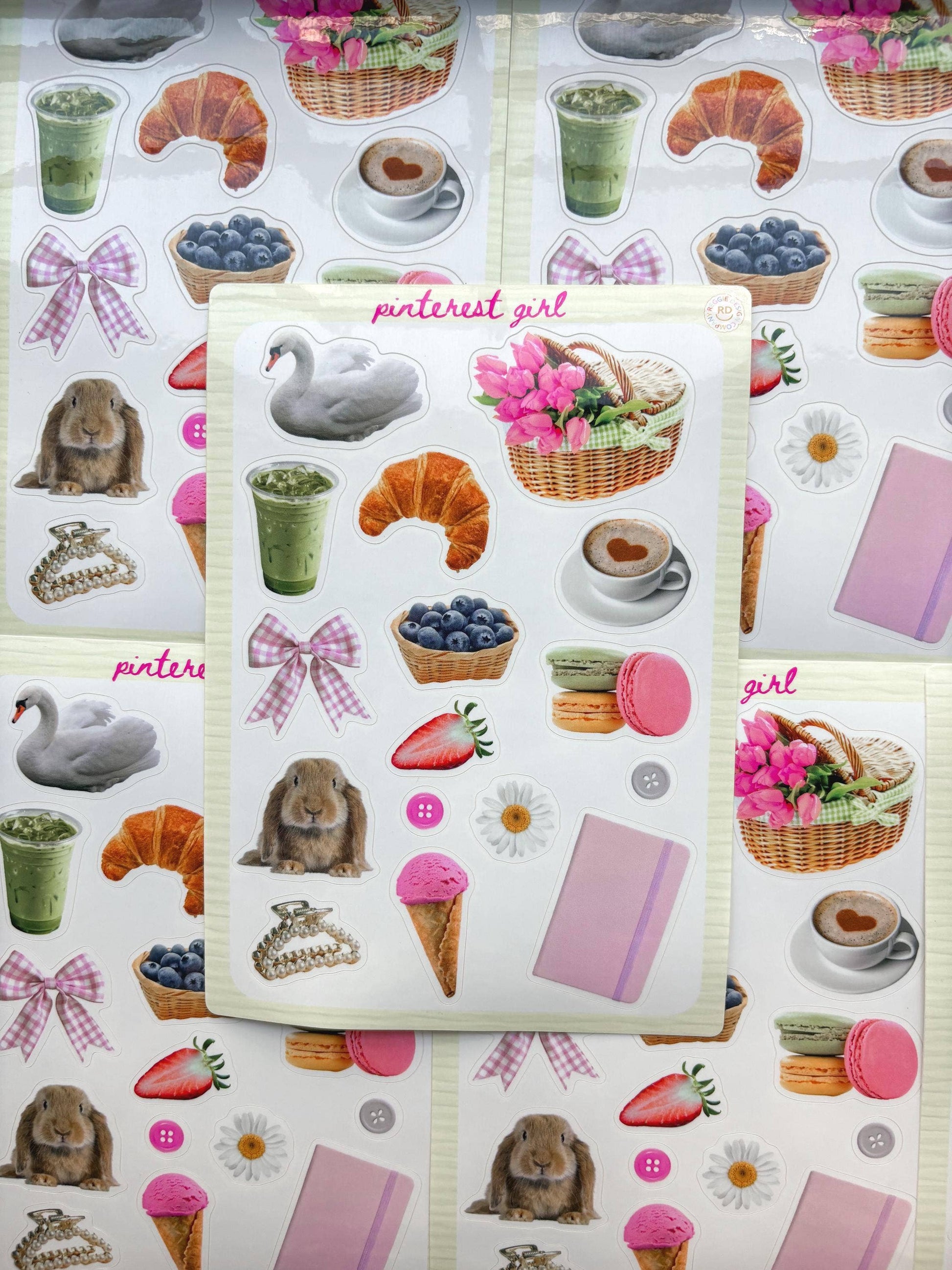 Aesthetic Sticker Sheet – 5x7 Glossy Vinyl Stickers for Journaling, Scrapbooking & Planners Add a charming vintage touch to your crafts with this 5x7 glossy vinyl sticker sheet! It features a delightful mix of pink and aesthetic elements, including a bunny, ice cream, coffee cup, and more. These stickers are perfect for journaling, scrapbooking, and planner decoration.
